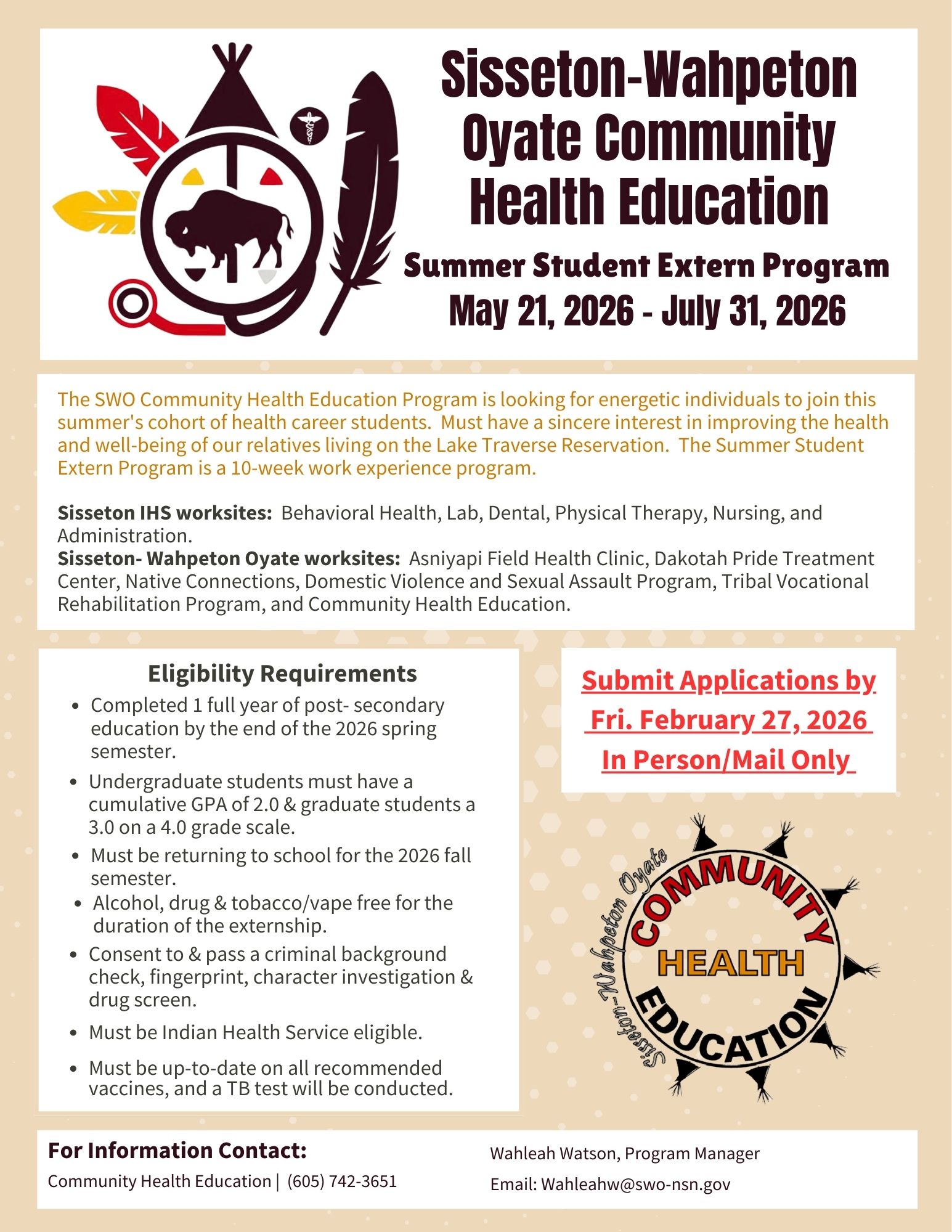 The Sisseton Wahpeton Oyate Higher Education Program funding is available to SWO Tribal members attending an accredited post secondary school full-time and part-time at the “undergraduate level”, “graduate level” and or “Professional Level” (e.g. Accredited by the Higher Learning Commission of the North Central Association of Schools and Colleges). Students must provide their SWO tribal enrollment verification. The field of study is not limited to any particular discipline. . Students applying for funding may attend any accredited college that is accredited by North Central Association of schools and colleges. Comprehensive universities, regional universities, two-year colleges, private institutions and online universities within South Dakota or outside of the state are acceptable as long as they are accredited. The award is disbursed to the student and is based on grade and credits earned. Award notification is given once all paperwork has been completed and submitted to the program. Deadline dates are stated on the eligibility notice. The deadline dates are approved by the Sisseton Wahpeton Oyate Tribal Council.
